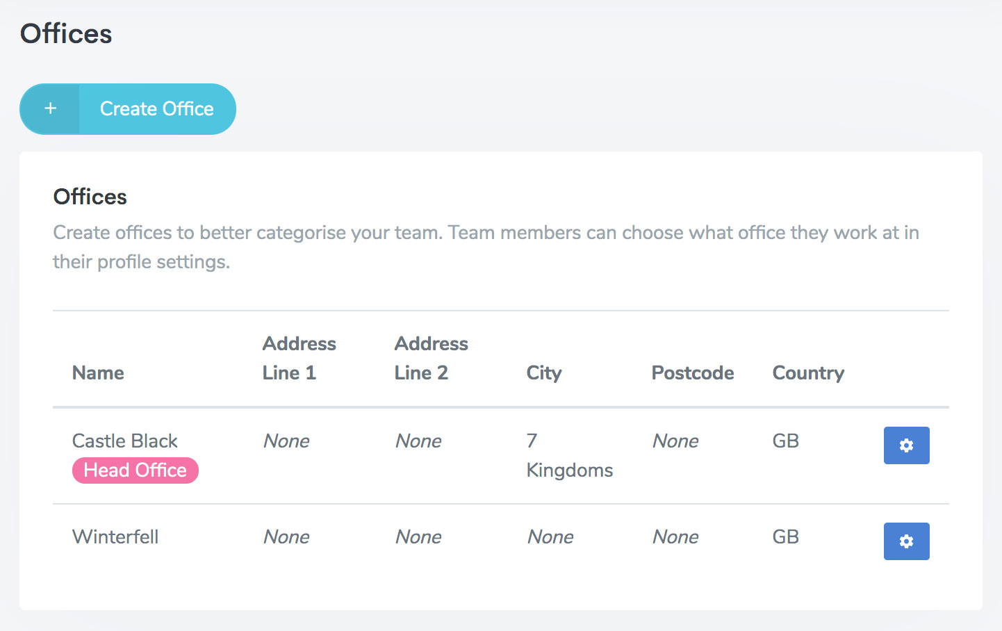 To get started, as Super Admin/Admin, click “Offices” under the “Company Settings” tab on the Dashboard. From here you can create and edit your available offices, see the image below.
