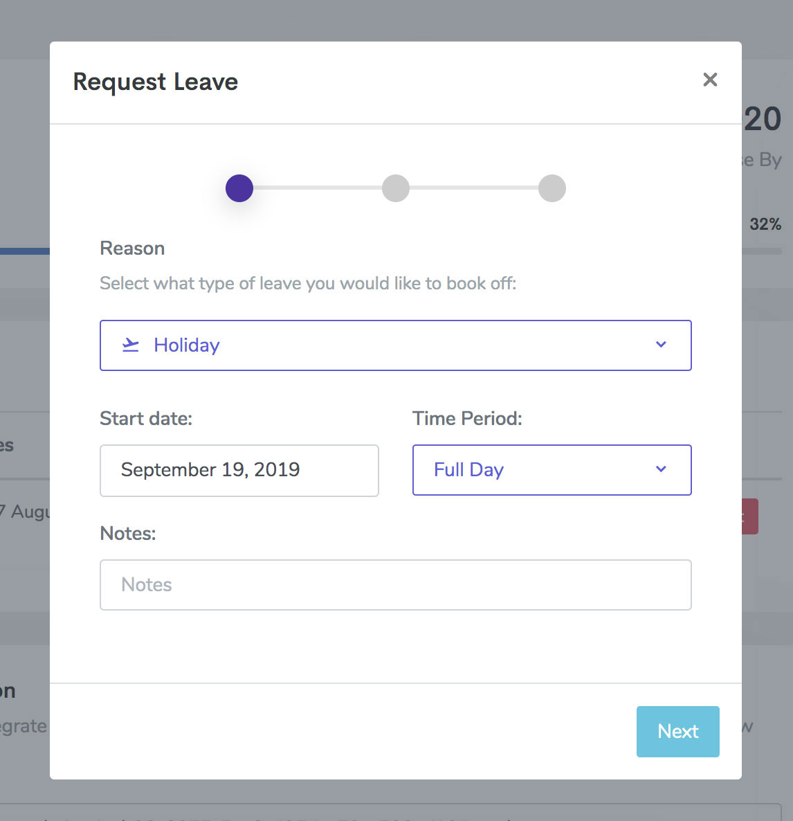 Clicking the blue “Request Leave” button will present you with the following popup, asking you several questions; the reason for the request, the start date, time period and any extra notes. These notes will only be visible for you and your Team Manager/Admin.