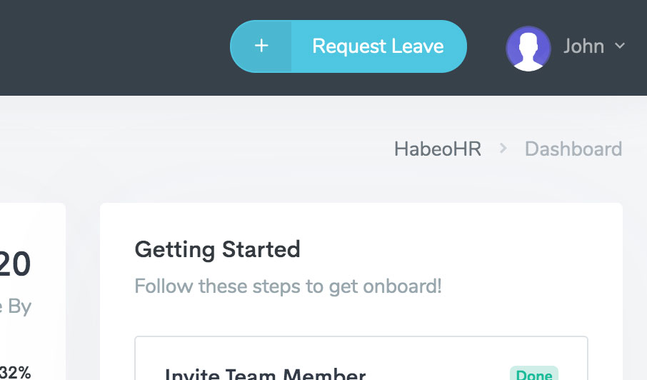 Requesting leave couldn’t be easier - on any page within the HabeoHR Dashboard - clicking the blue button on the top right hand corner will present you with a popup window. See the image below for the button position.